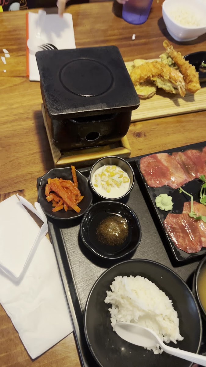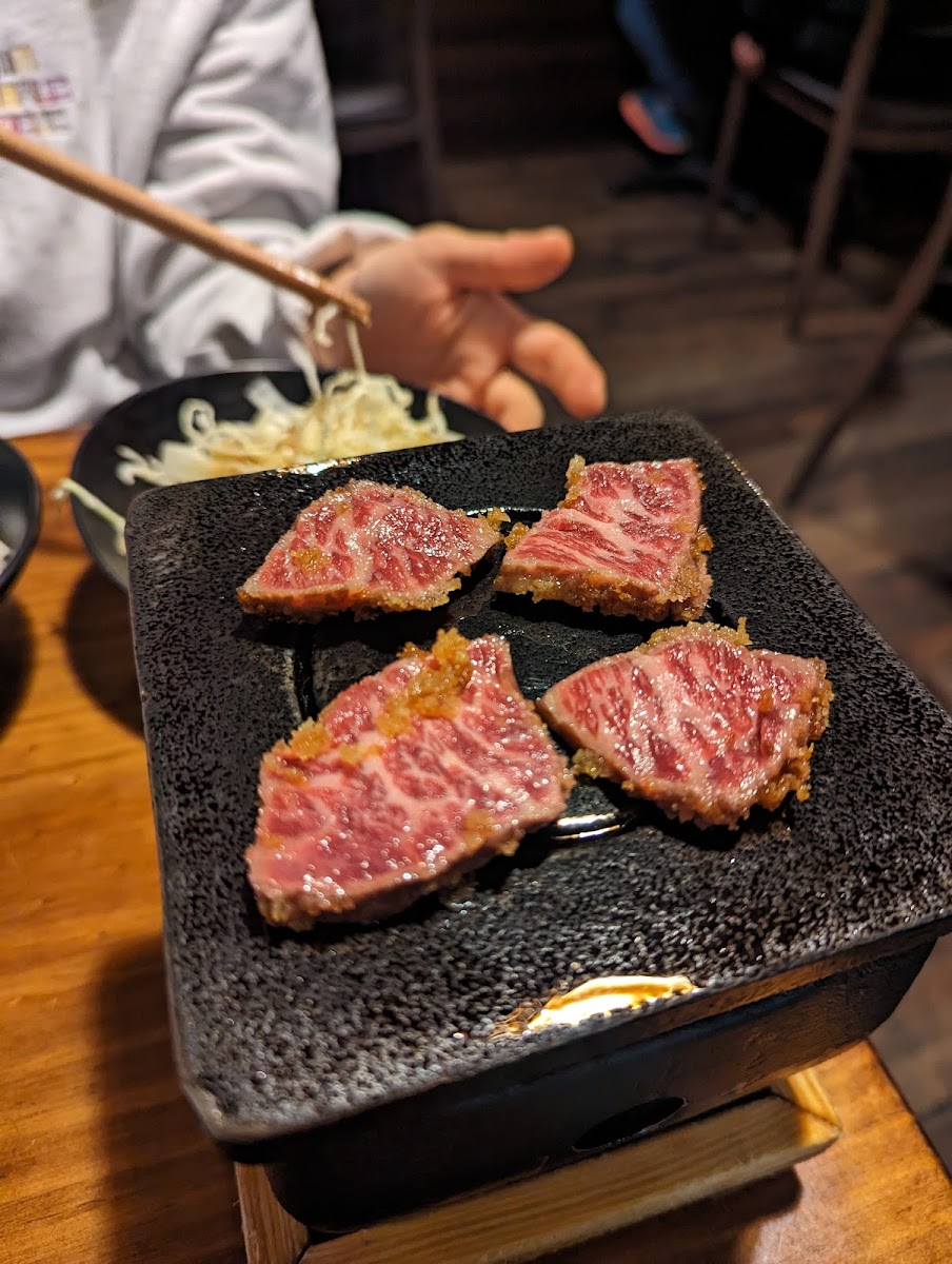 Amazing quality A5 and the beef gyukatsu was also so tasty. The sides and sauces were also good and portioned well. The creamy udon was rich and the curry flavor was strong but not too salty. We didn't try any appetizers but the portion was more than enough fpr two of us. We also ordered the wagyu with the aides and breaded beef katsu without sides which was still more than enough food for two. For drinks they did have some and a canned highball that looked good. We got an order of corn cheese that we didn't originally order but was given to us anyways and from now on, we will be ordering that whenever we go! The staff were very efficient and filled water glasses often. They also relit one of our stone grills that went out so we could cook the last of our meat. Came around 730 pm on a Saturday and waited maybe 15 minutes. The parking lot is small so at peak times it'll be packed. Plenty of street parking though.